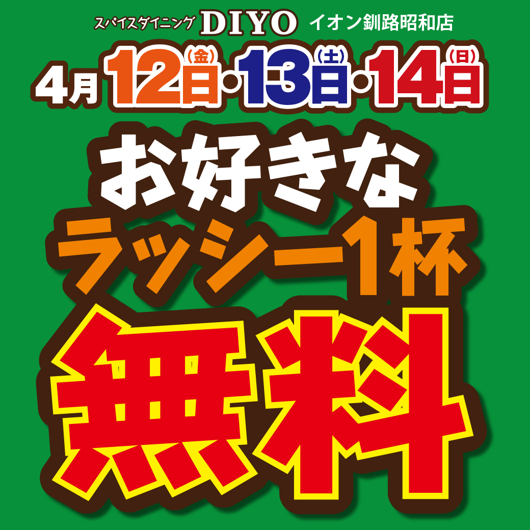 本日から3日間、ラッシー1杯プレゼントキャンペーンを実施致しますプレーン、ストロベリー、メロン、キウイ、ブルーベリー、ラズベリー、マンゴーの中からお好きな味をお選び頂けます(3 hearts)(カレーをご注文のお客様。テイクアウト不可。キッズセットやプレーンラッシー付きセットメニューも味付きラッシーに変更可能です。)
