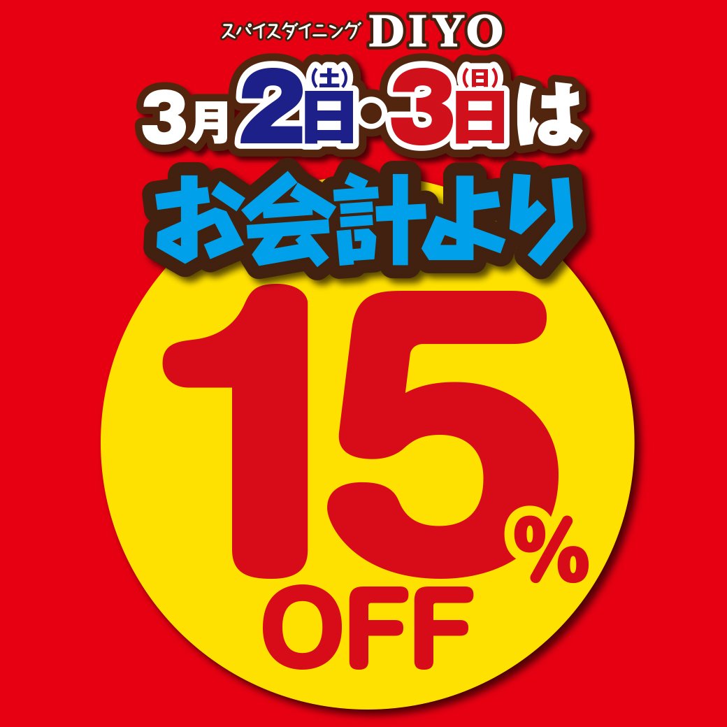 3月2日(土曜日)3日(日曜日)はお会計より15%OFFキャンペーンを開催致します(全ての商品対象です。)テイクアウトも15%OFFになりますので、本格ネパールカレーをご自宅でもご賞味頂けます。